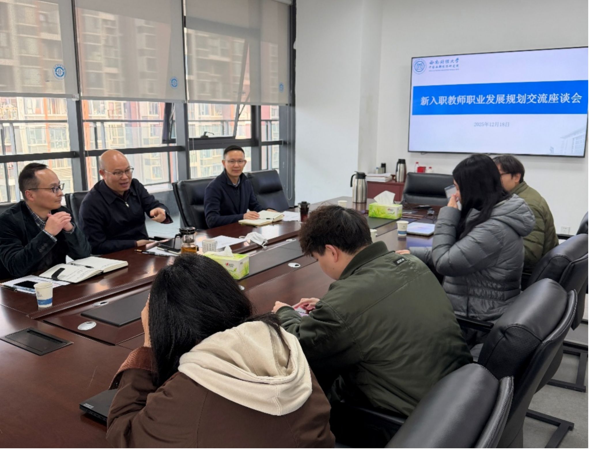 在格致楼1020会议室召开2025年度新进教师职业发展规划指导交流会。人事处副处长周立成到会指导,研究院院长毛中根、党委书记冯卫东、4名新进教师以及职业发展辅导人出席。毛中根主持会议。